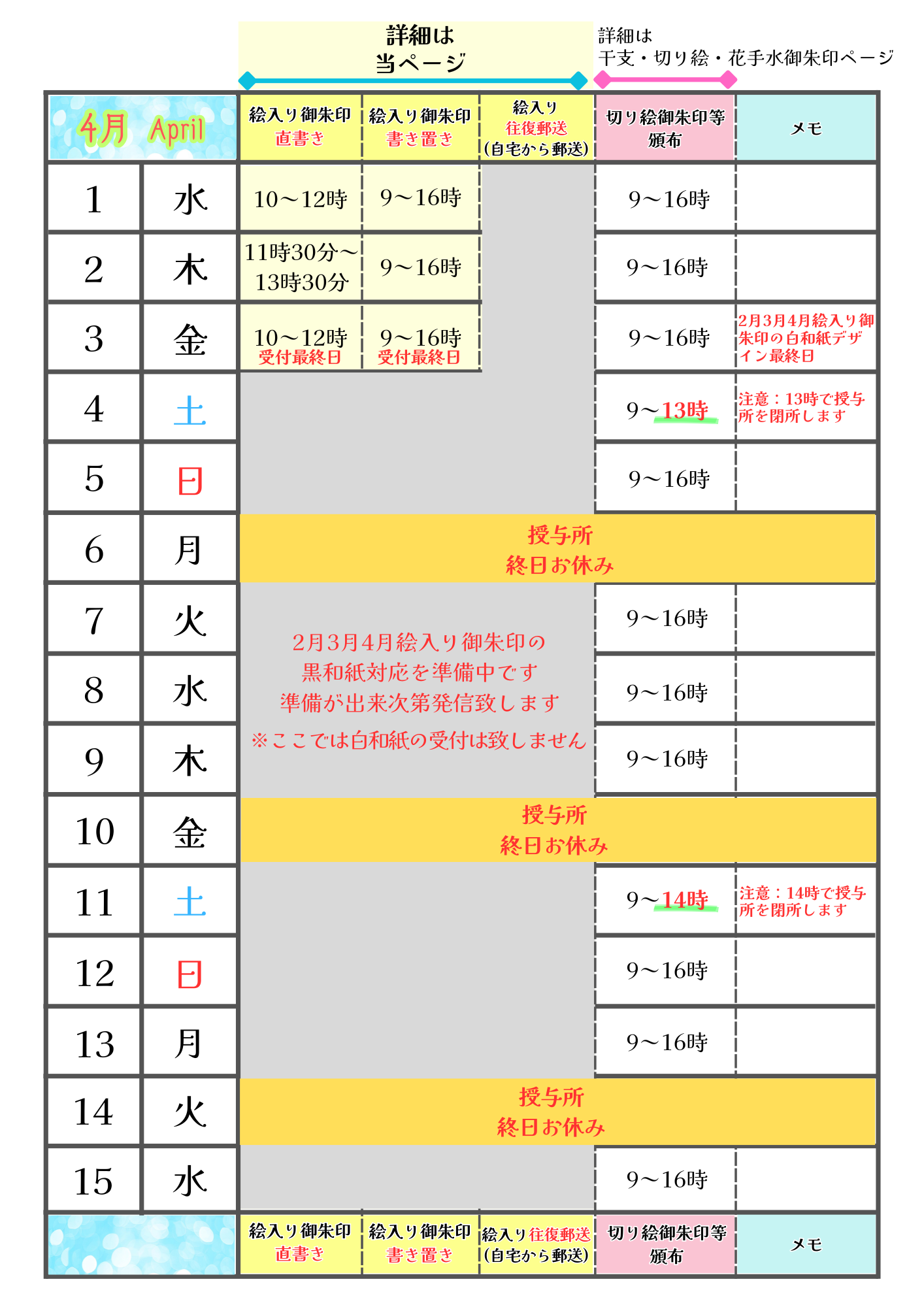 絵入り御朱印 受付予定表