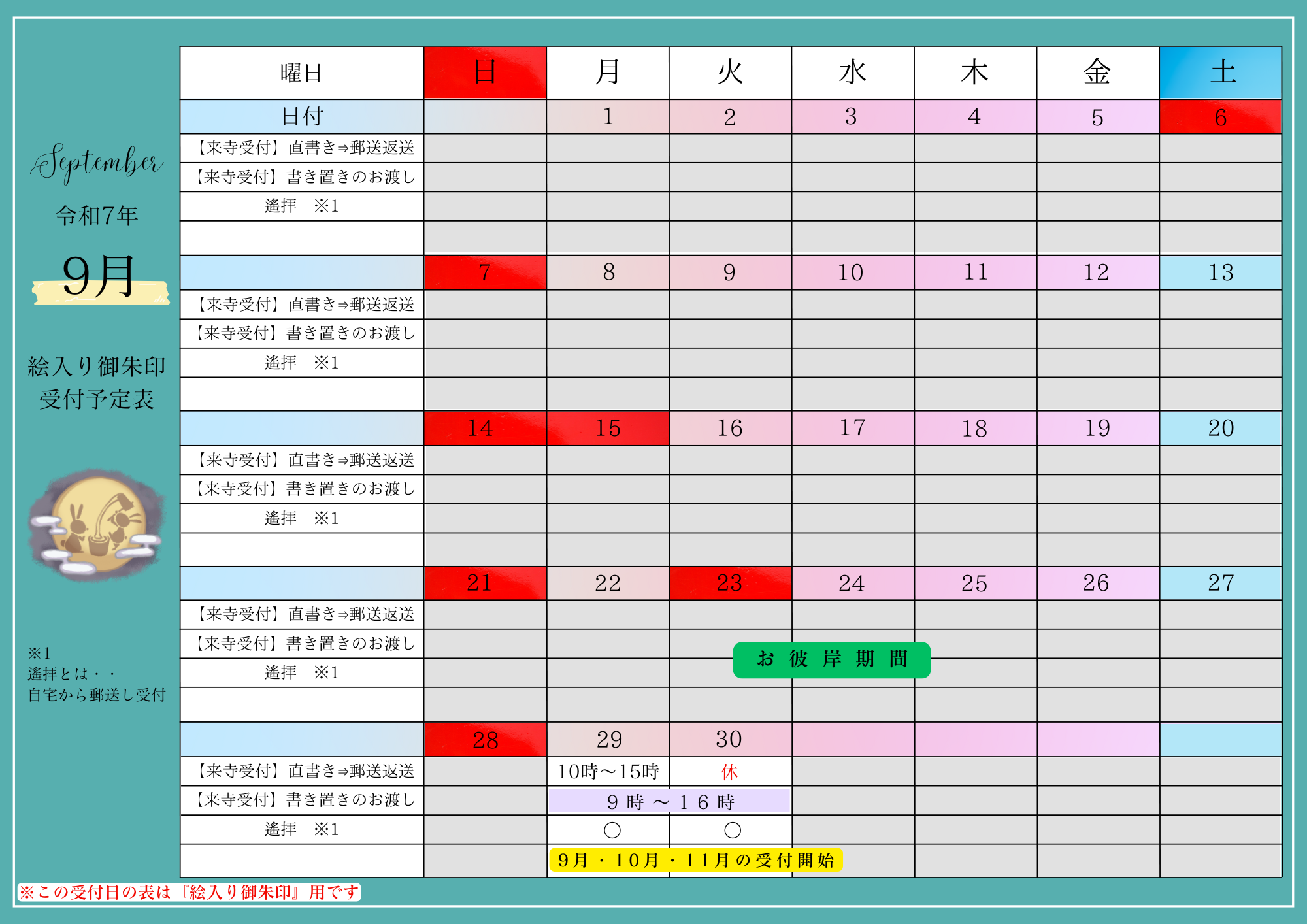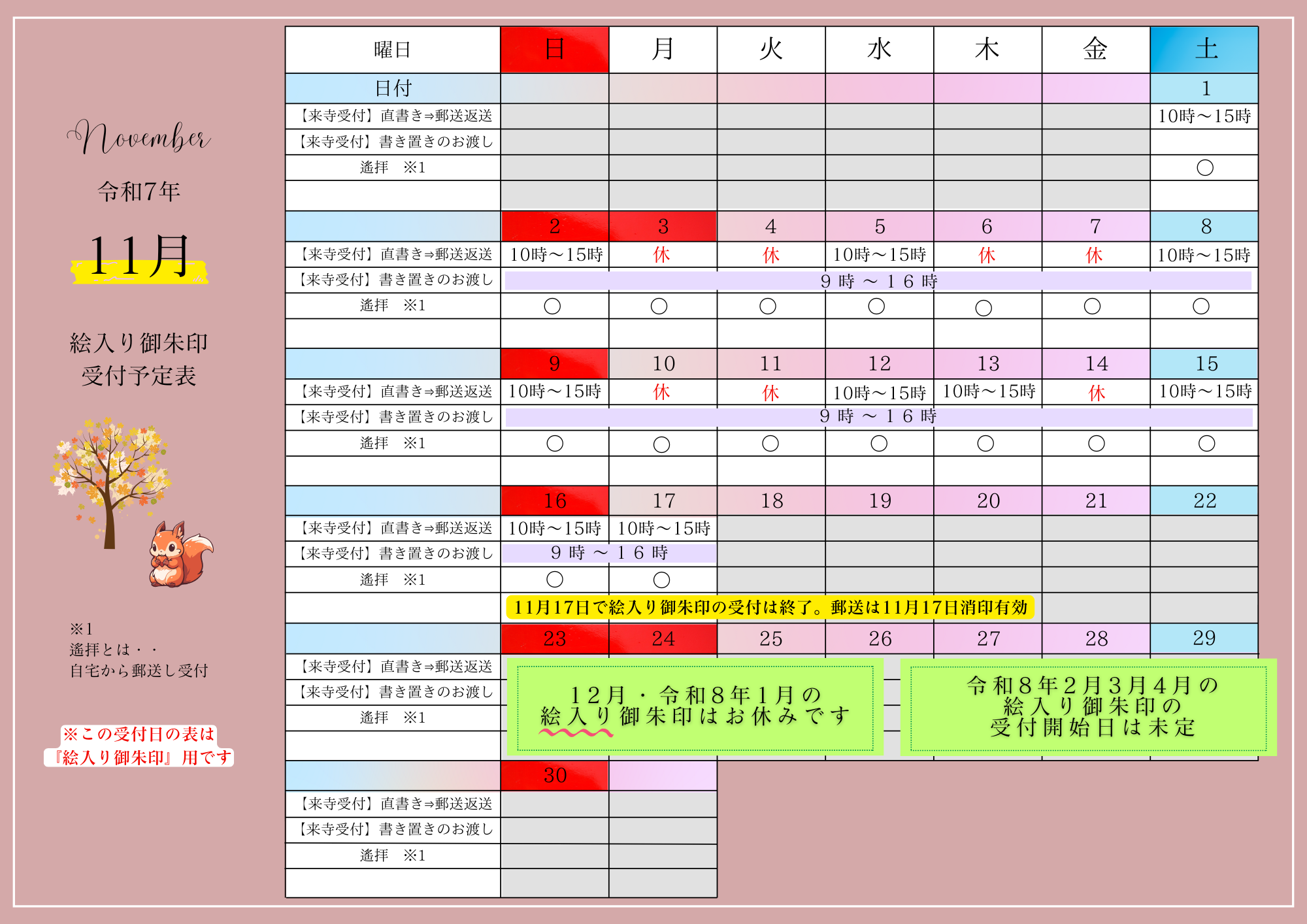 絵入り御朱印 受付予定表