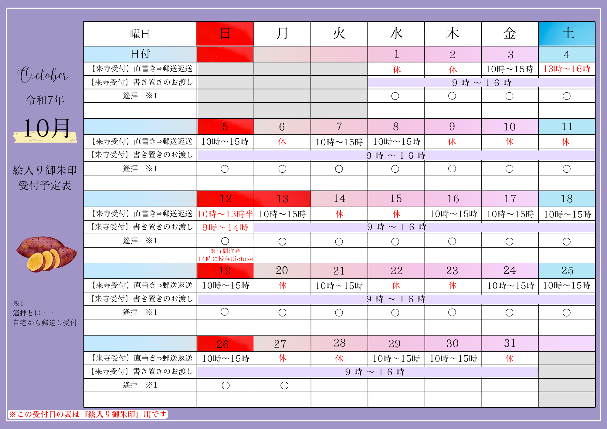 10月12日(日)はお寺の用事で、授与所を14時にcloseします。