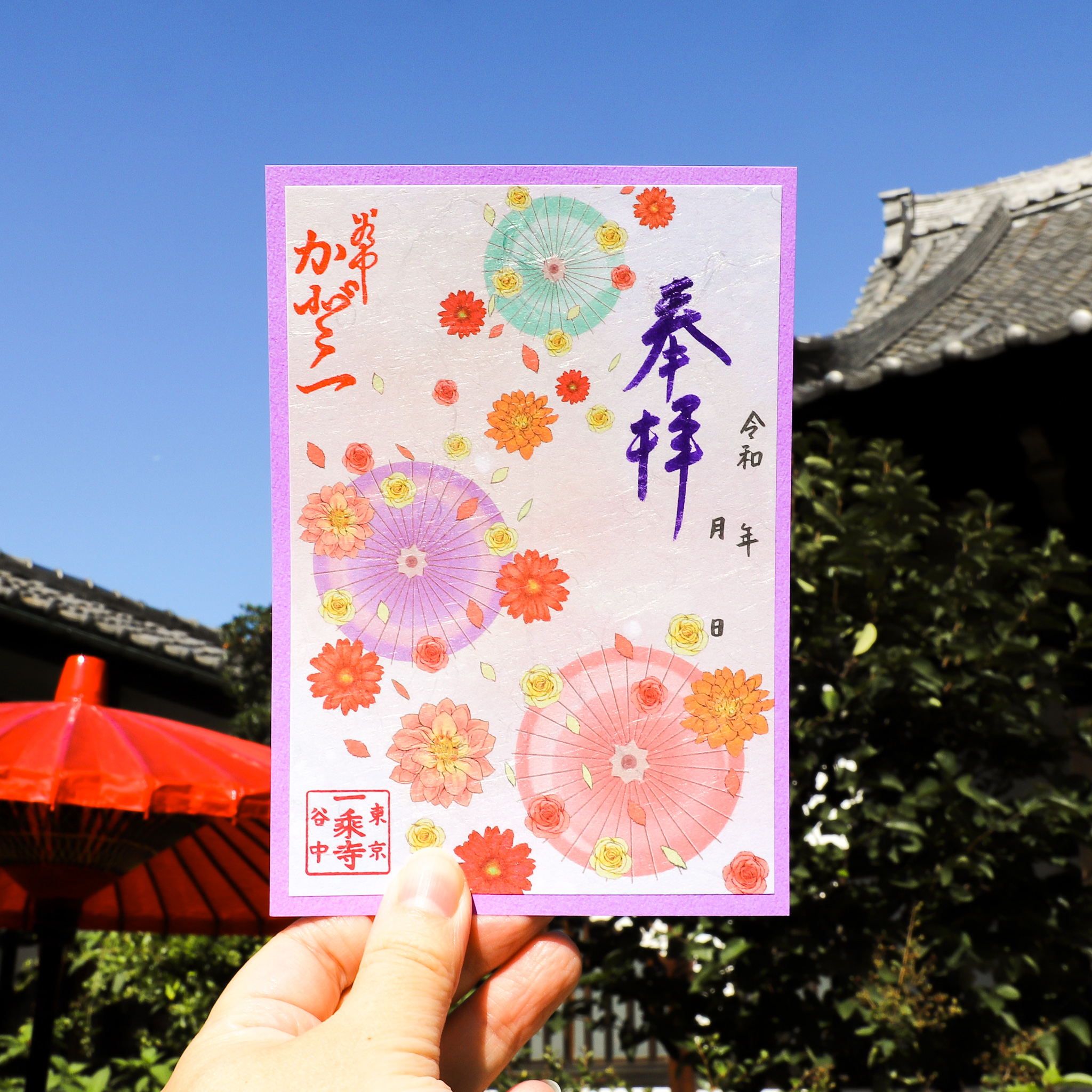 花手水御朱印 第6弾の登場です。今回の御朱印は番傘と花が描かれた華やかなデザインです。